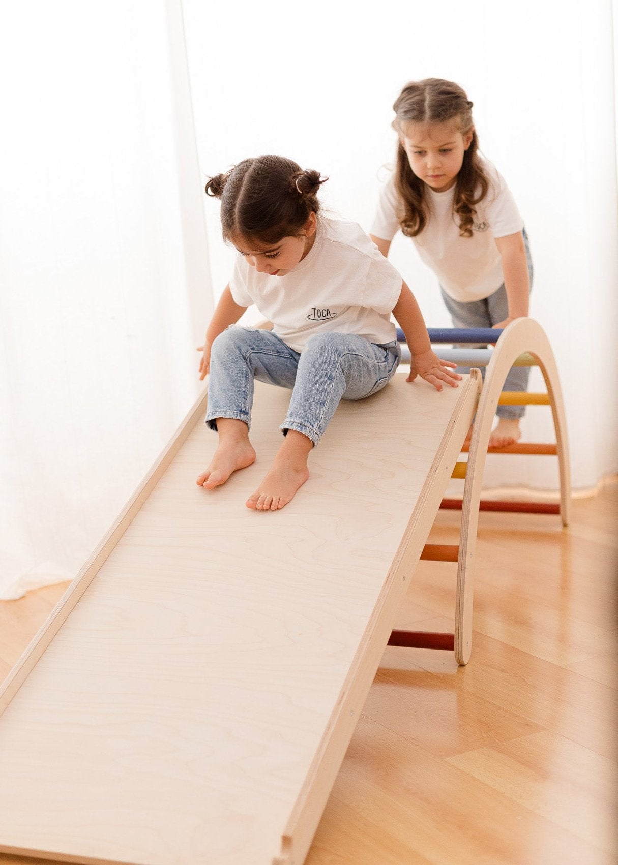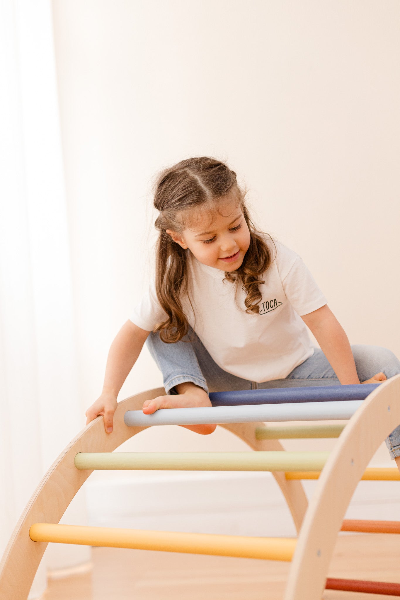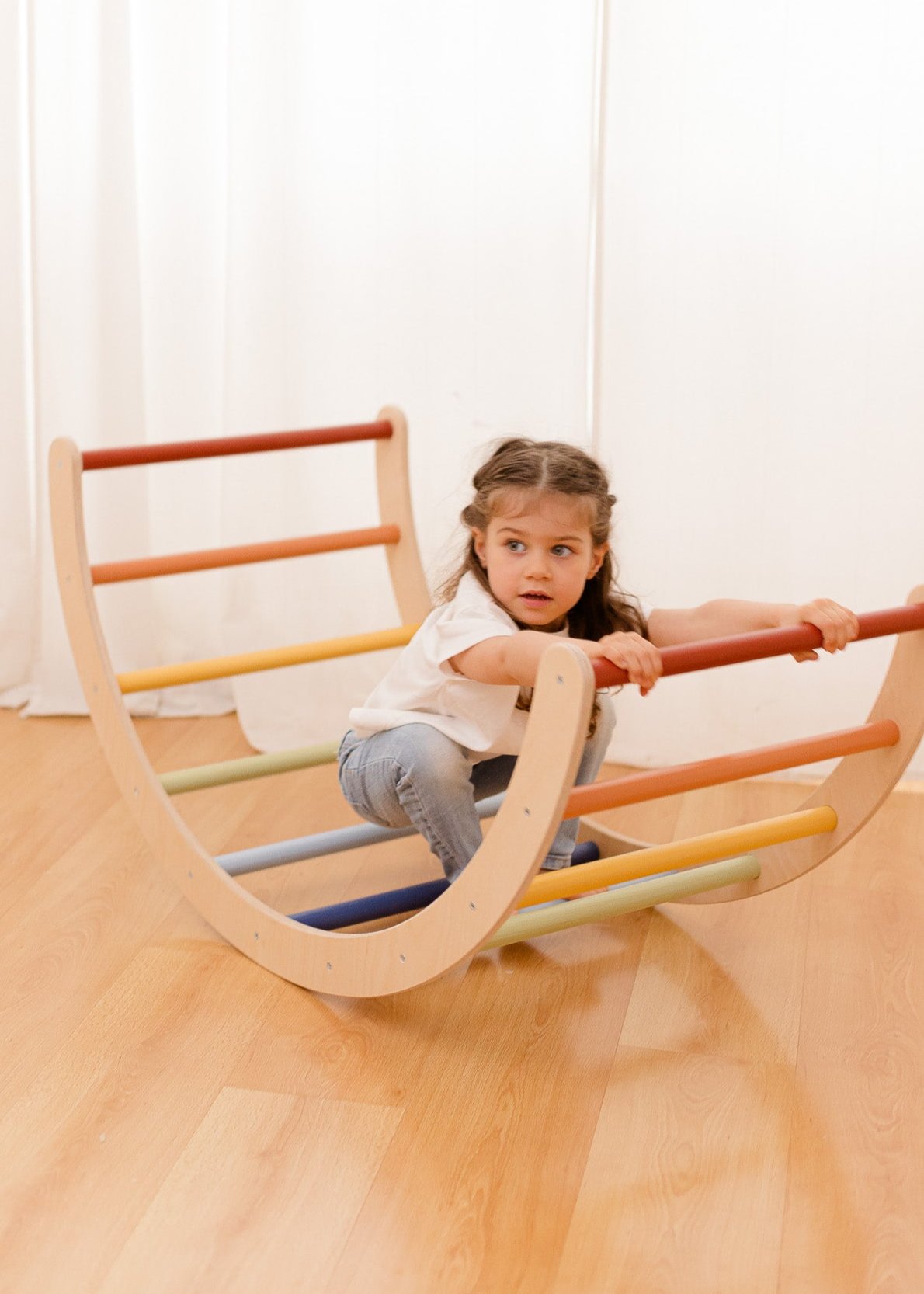 O Arco Pikler é um brinquedo educativo em madeira que estimula o desenvolvimento motor das crianças de forma segura e divertida. Promove o equilíbrio, a coordenação, a agilidade e a criatividade, permitindo o movimento vertical e horizontal em simultâneo.