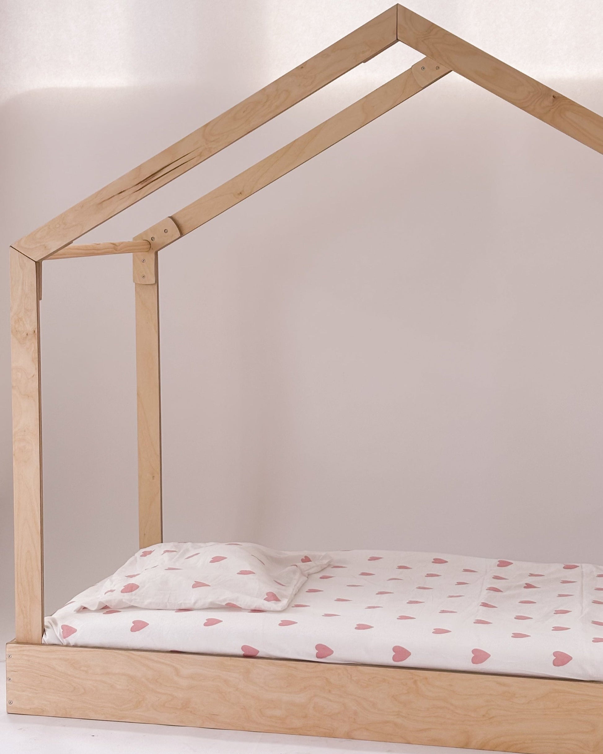 Fabricada em madeira natural de alta qualidade, possui uma estrutura em forma de casinha que pode ser removida facilmente, adaptando-se ao crescimento da criança e ao estilo do quarto.